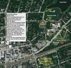 There are designated spots on Crescent Blvd. and in the Biester Gym parking lot.